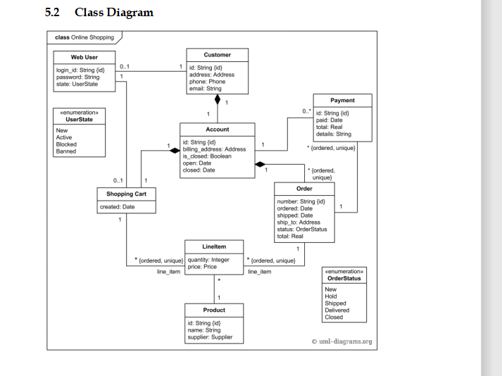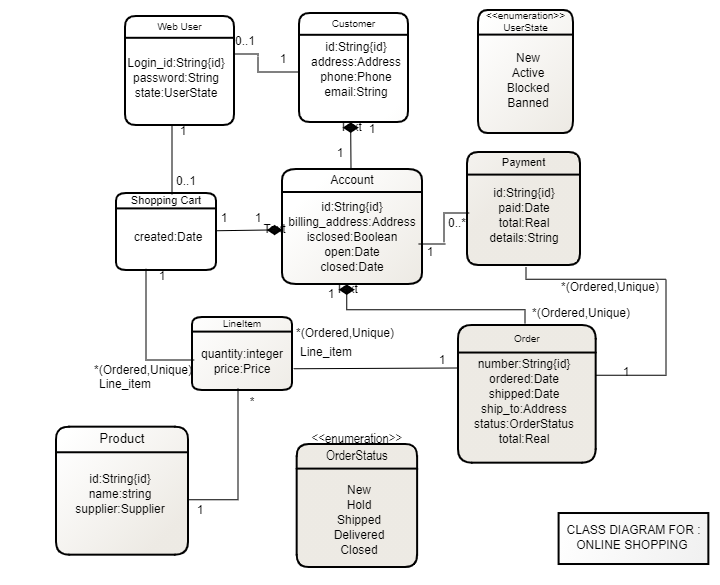 Online Shopping UML Class Diagram Example. Here we provide an example of UML class diagram which shows a domain model for online shopping. The purpose of the diagram is to introduce some common terms, "dictionary" for online shopping - Customer, Web User, Account, Shopping Cart, Product, Order, Payment, etc. and relationships between.