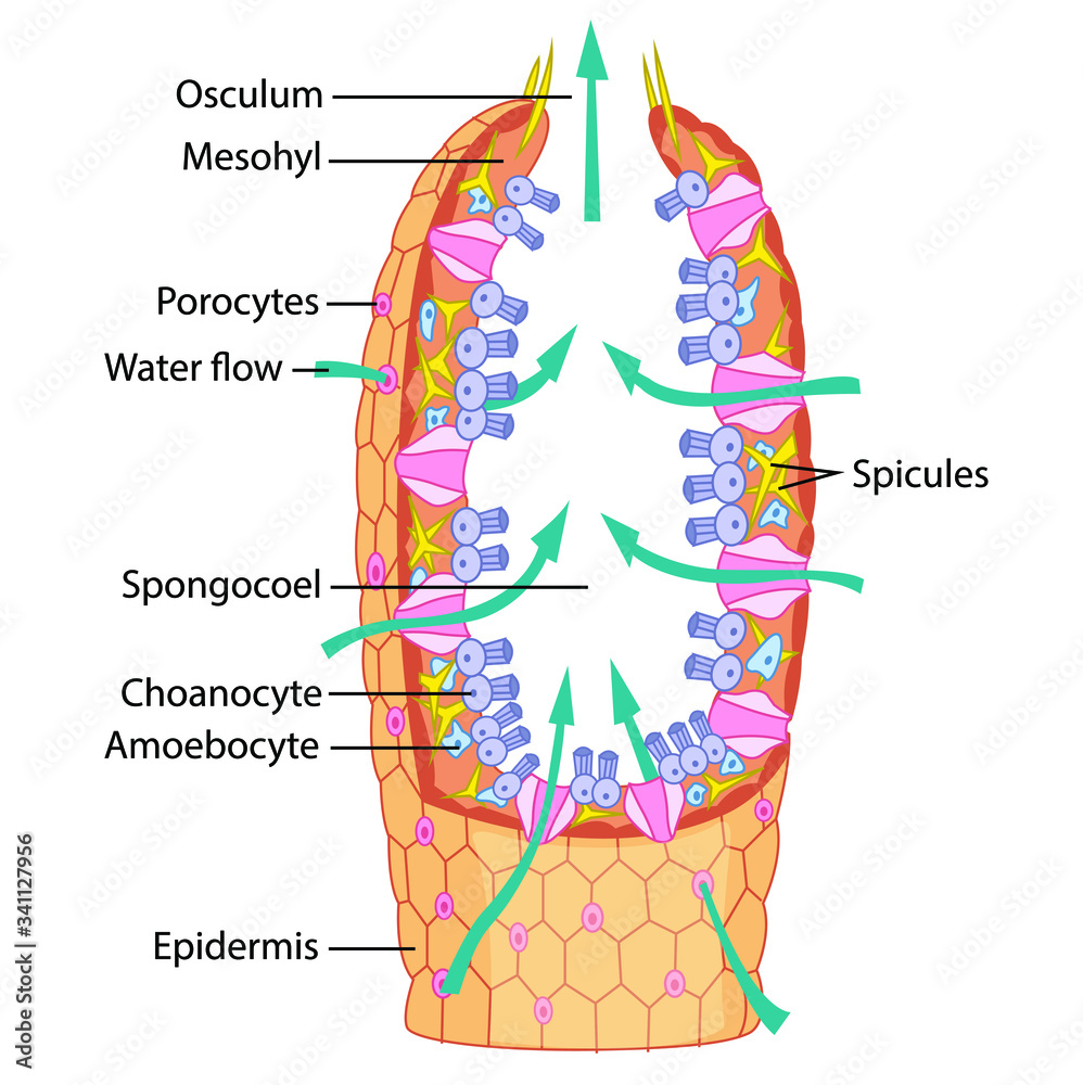 See the answer. See the answer See the answer done loading. 1.Identify/label the following structures in the sponge diagram. choanocytes. radial canal. spongocoel. osuculum. - Trace the flow of water through the structures listed above. - What cells of the sponge create the water flow and how do they generate the flow?