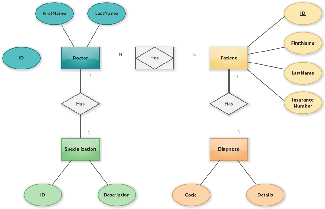 Doctor and Patient (Chen ER Diagram) - Software Ideas Modeler Chen ER Diagram for Doctor and Patient. This ER diagram uses Chen notation and depicts the relationship between doctor and patient . Doctor and Patient (Chen ER Diagram) The model includes these entities: Doctor. ID. First Name. Last Name. Patient.