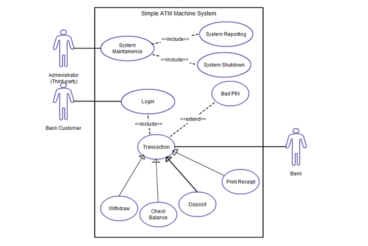 Bank ATM UML diagrams examples - use cases, state diagram ... Summary : Bank ATM is typically made up of several devices such as central processor unit (CPU), cryptoprocessor, memory, customer display, function key buttons (usually located near the display), magnetic and/or smartchip card reader, encrypting PIN Pad, customer receipt printer, vault, modem.